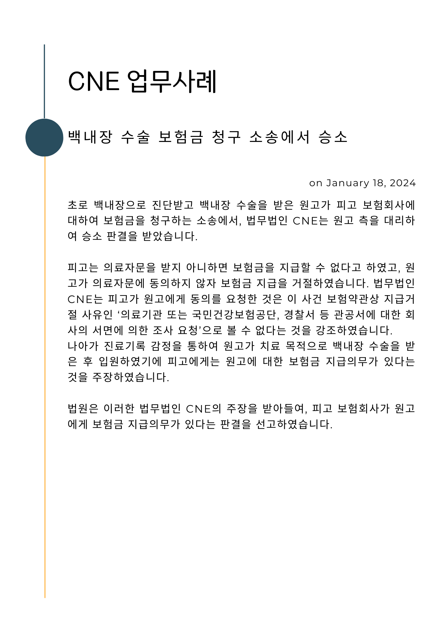 [업무사례] 백내장 수술 보험금 청구 소송에서 승소