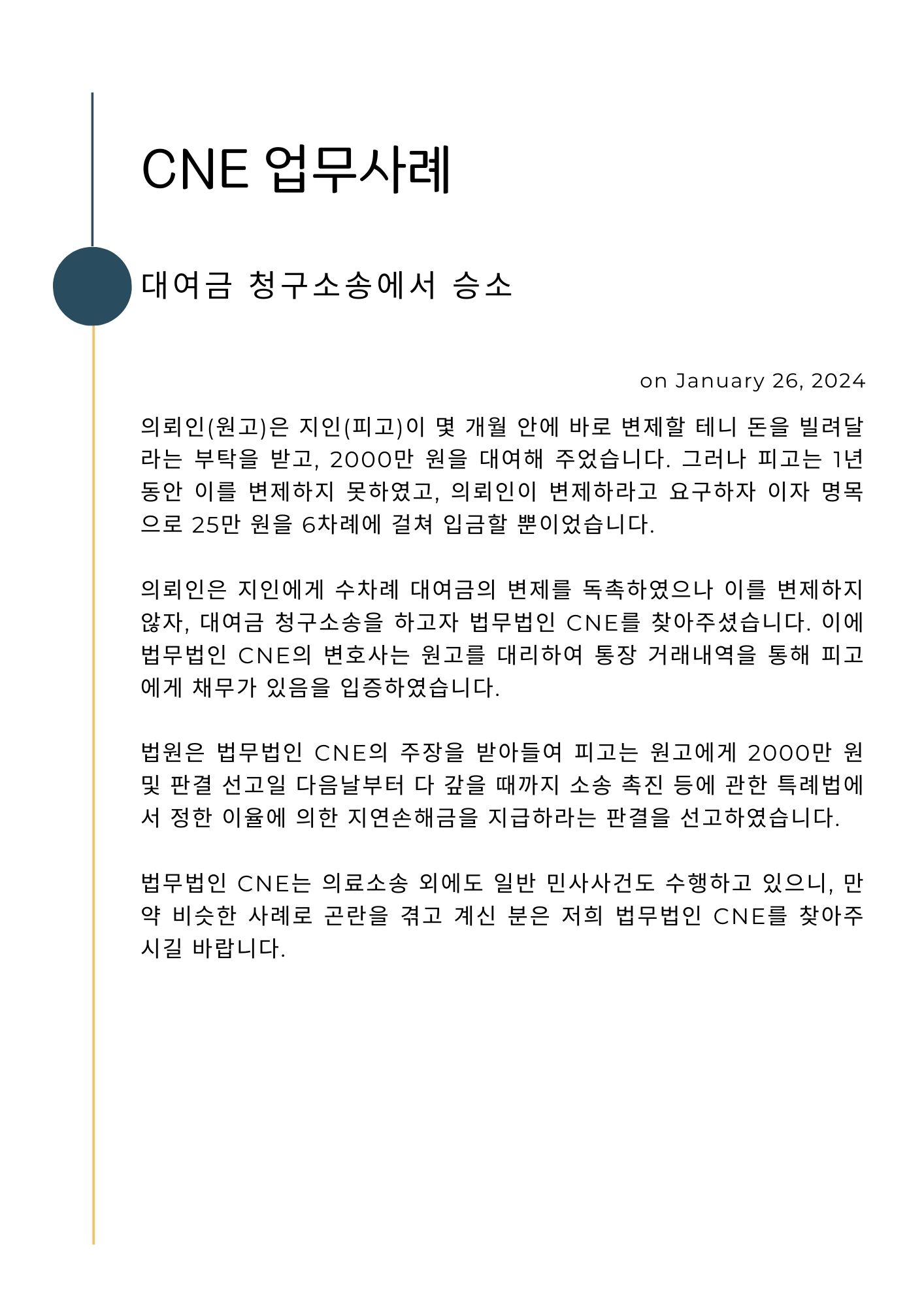 [업무사례] 대여금 청구소송에서 승소