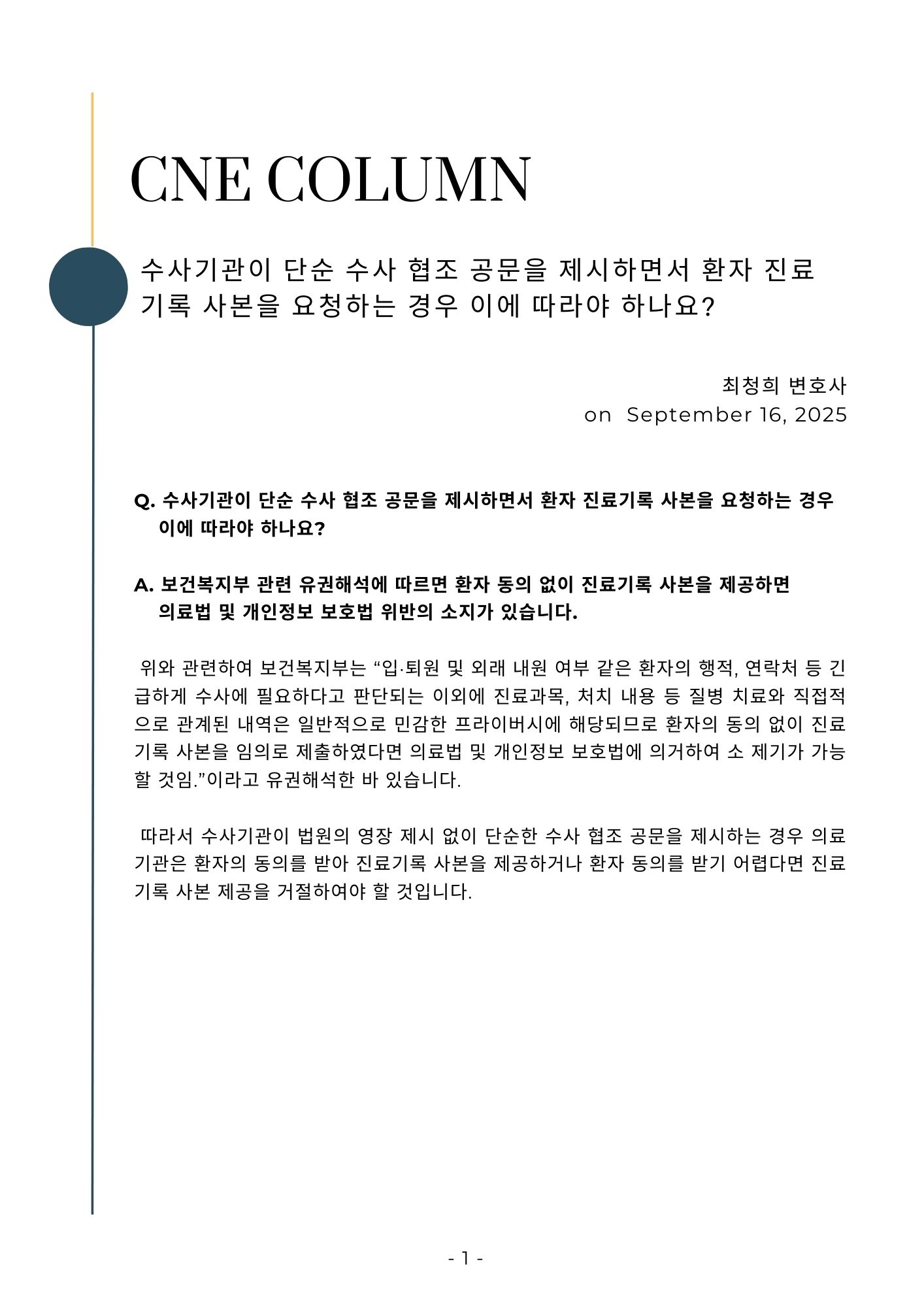 [칼럼] 수사기관이 단순 수사 협조 공문을 제시하면서 환자 진료기록 사본을 요청하는 경우 이에 따라야 하나