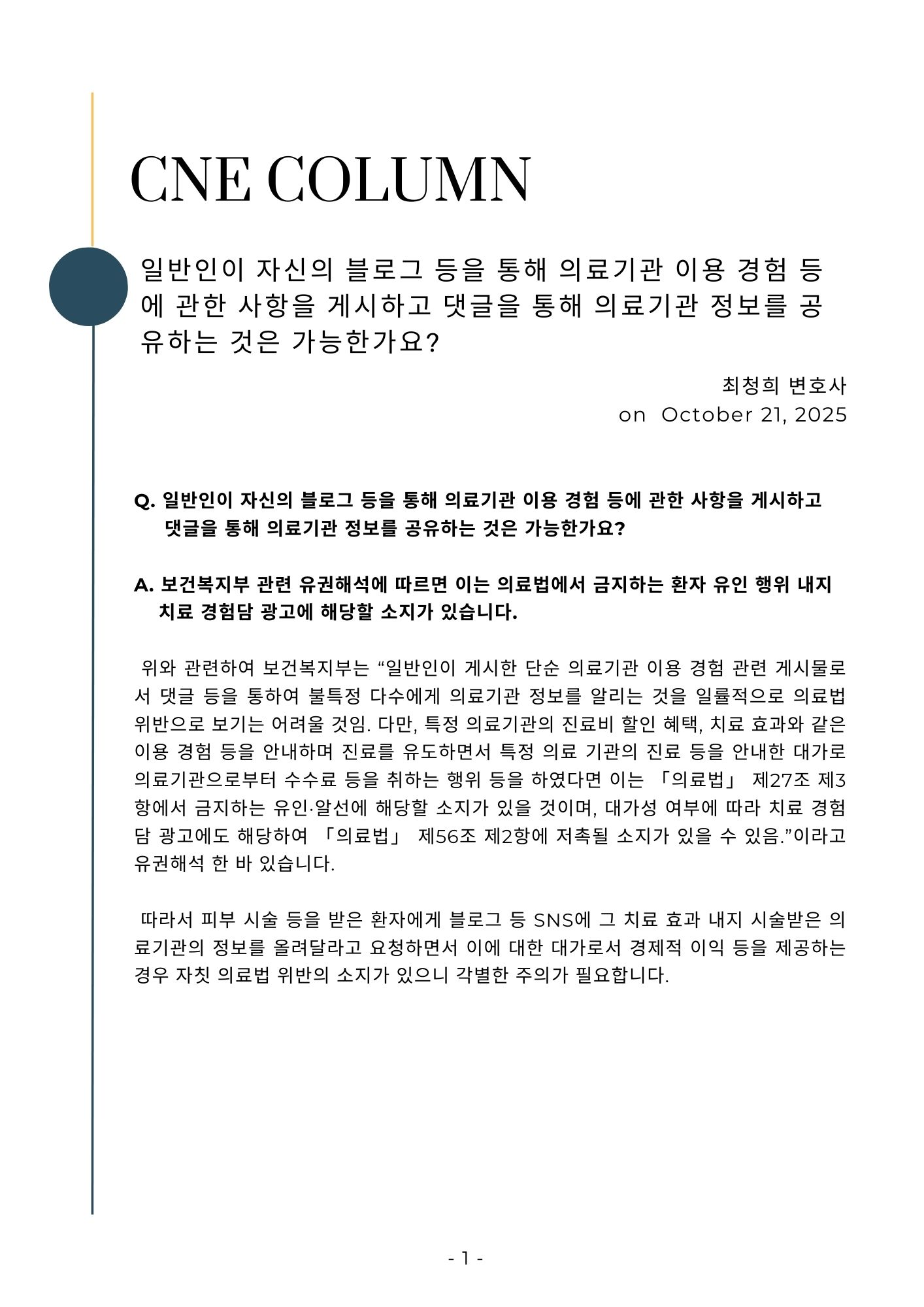 [칼럼] 일반인이 블로그에 의료기관 이용 경험 등을 게시하고 댓글로 정보를 공유하는 것은 가능한가