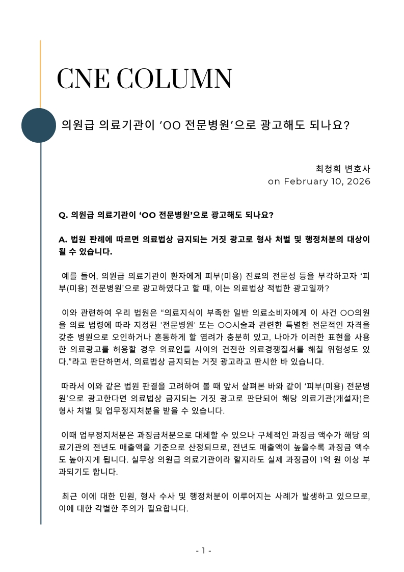 [칼럼] 의원급 의료기관이 ‘OO 전문병원’으로 광고해도 되나